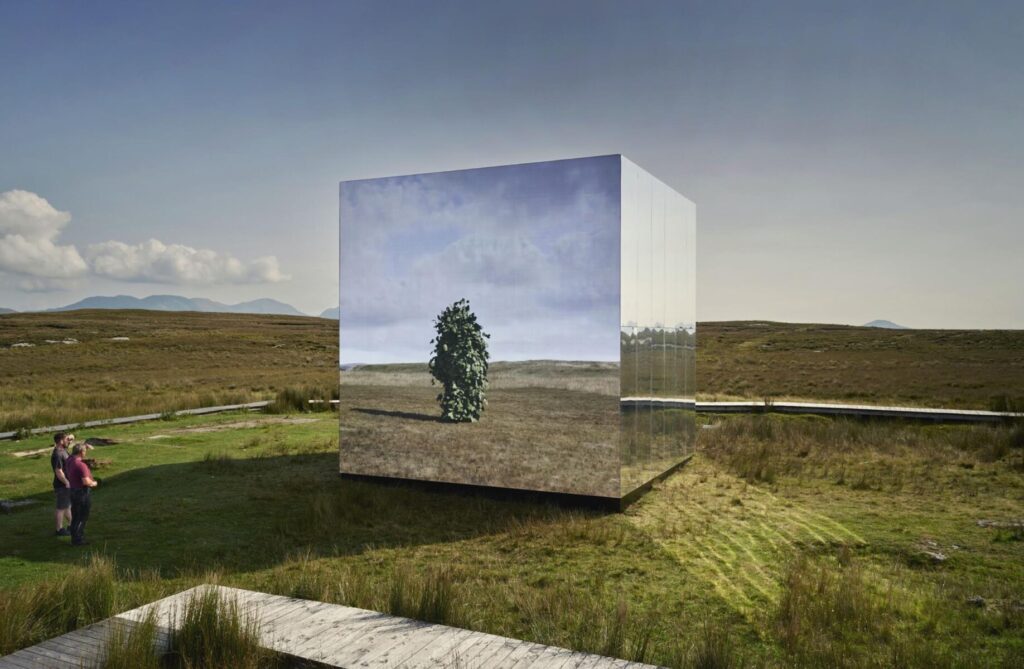 The second part of artist John Gerrard’s Mirror Pavilion, Leaf Work (Derrigimlagh) 2020 reflects and responds to landscape at the spectacular 4,000-year-old Derrigimlagh Bog which was the site of the first transatlantic radio signal from the Marconi station in 1907 and the landing place for Alcock and Brown’s first transatlantic plane crossing in 1919.
